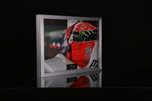 A hand-painted carbon plate in the style of the helmet makes this work of art a real eye-catcher. This picture was refined with a high-quality aluminum frame, combined with anti-reflective museum glass. Total size 44 x 34 cm with 4 cm height.